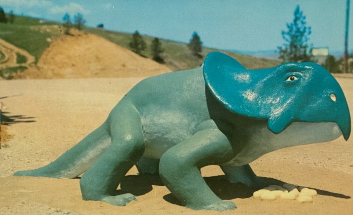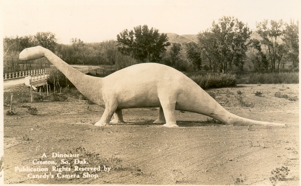 Earlier, in 1933, Sullivan made a dinosaur statue as a tourist lure for a general store in Creston, South Dakota (souvenir post card, below).