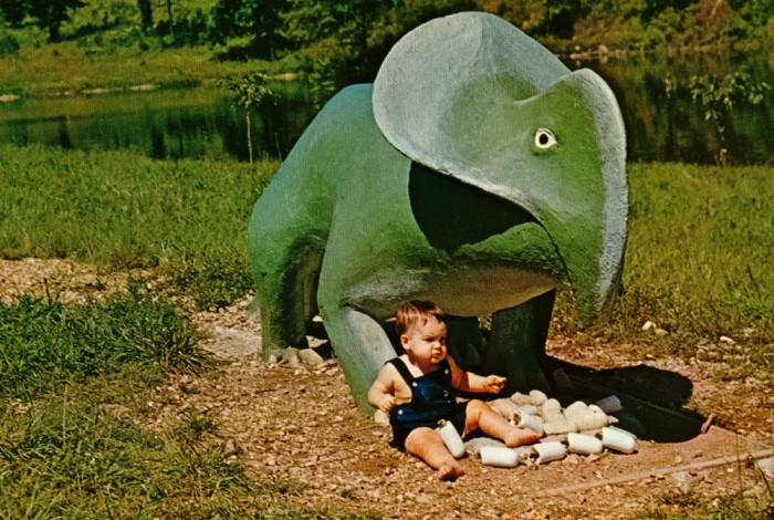 Postcards from Farwell’s Dinosaur Park (AKA The Land of Kong), Eureka Springs, Arkansas, showing more of Sullivan’s life-sized dinosaur statues. The park was once owned by movie star John Agar.