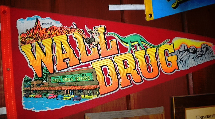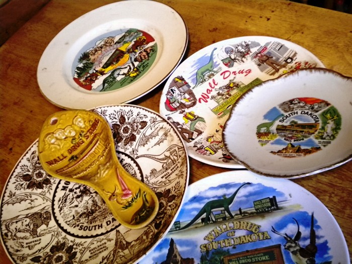 Souvenir plates including the Apatosaurus Sullivan made for Wall Drug.