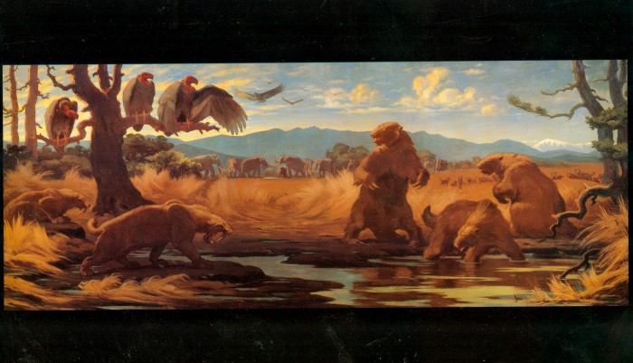 American Museum of Natural History, NYC, postcard (below) reproducing a mural painted in 1921 by Charles R. Knight for its Hall of Fossil Mammals depicted a hypothetical scene at what is now Rancho La Brea, with several Paramylodon individuals seen at the right.