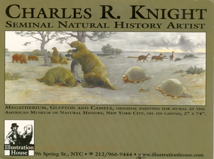 Postcard promoting an exhibition of original artwork by Charles R. Knight, showing (middle and left) another giant ground sloth, Megatherium americanum, from a mural Knight did for the American Museum of Natural History, New York, NY.