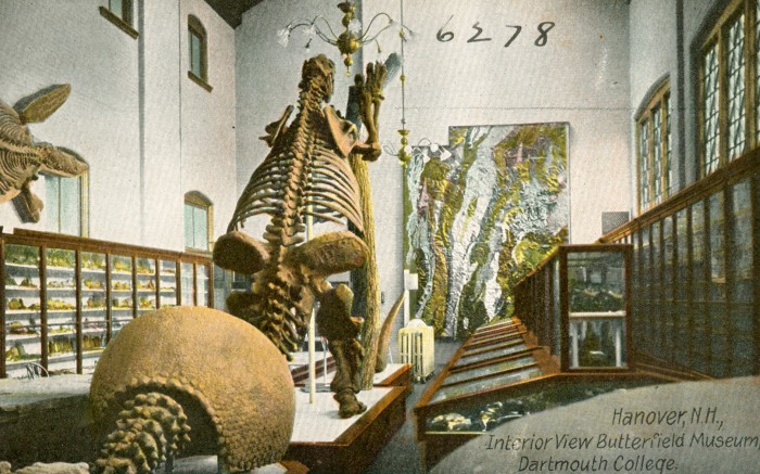 Some souvenir postcards relating to other kinds of ground sloths. First, a postcard showing a Wards plaster cast of the skeleton of the giant ground sloth Megatherium americanum (also other Wards fossil casts) mounted in the Butterfield Museum, Darthmouth College, Hanover, NH.