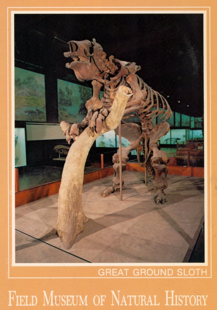Souvenir postcard from The Field Museum, Chicago, IL, showing a skeleton of the giant ground sloth Megatherium americanum, collected in Bolivia in 1926-7 by paleontologist Elmer S. Riggs.