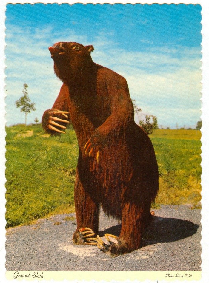 Postcard (1986) from the Iowa Hall of the University of Iowa Museum of Natural History showing a life-sized model of another kind of giant ground sloth, Megalonyx jeffersoni.