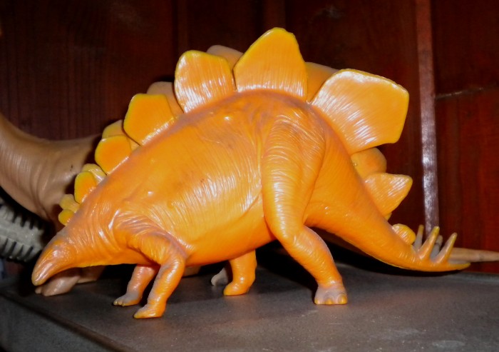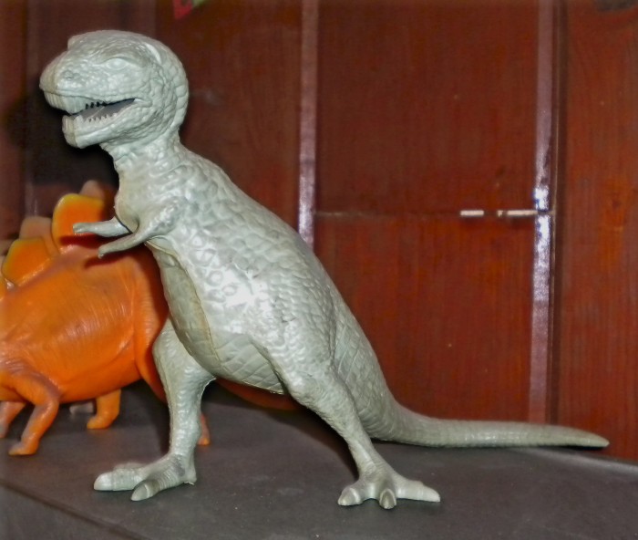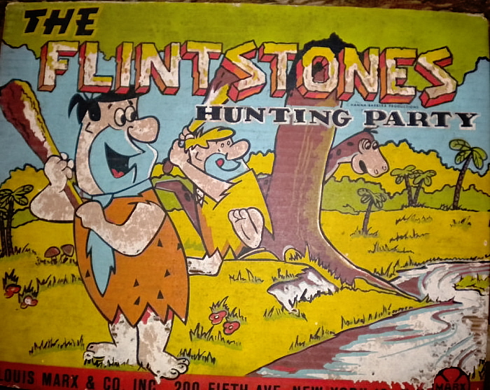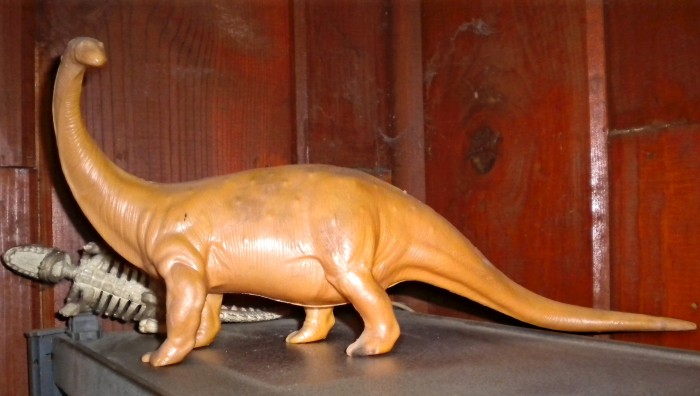 Made by Marx, this Flintstones Hunting Party set — based on Hanna-Barbera’s hit TV cartoon series — included three dinosaur figures, the Stegosaurus copied (albeit “reversed”) from the classic early 20th Century model sculpted by paleontologist Charles Whitney Gilmore. The Tyrannosaurus figure was based — also “reversed” and with the mouth open — on this famous painting by artist Charles R. Knight, done in 1906 for New York’s American Museum of Natural History.