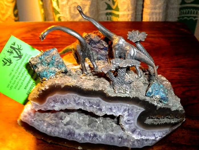 A geode with two metal brachiosaur figures.