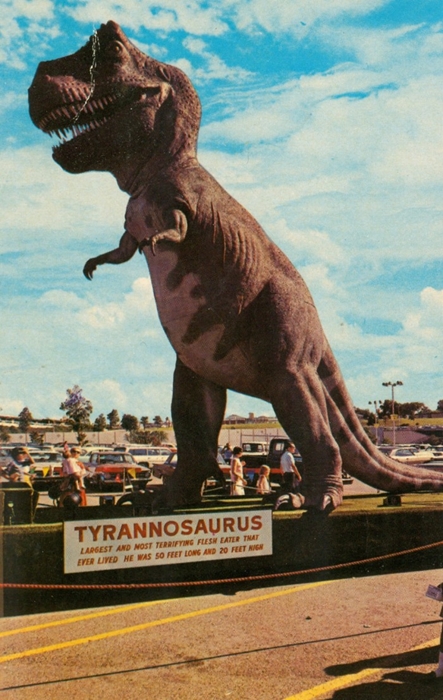 During the late 1930s, Roland T. Bird collected for the American Museum of Natural History, New York City, a number of Early Cretaceous dinosaur fossil footprints at the Paluxy River, near Glen Rose, Texas. These specimens included a trackway recording the pursuit of a sauropod dinosaur by a theropod. Shown here are two souvenir postcards from the American Museum, both dated 1939, the one above showing local boy Tommy Pendly inside one of the water-filled sauropod tracks; the other, locals selling dinosaur footprints as rock garden ornaments. The Tyrannosaurus statue was built by the Jonas Studios for the 1964 New York World’s Fair.