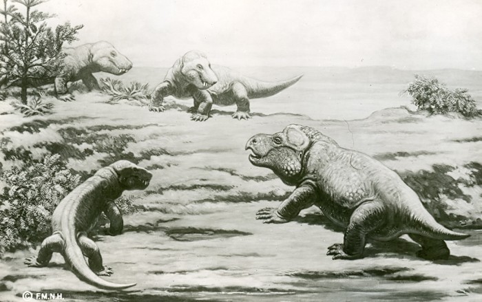 Souvenir postcard from the Chicago Natural History Museum (now The Field Museum) reproducing, in black and white, a painting by artist Charles R. Knight of Triassic-periood therapisids — three carnivorous Cynognathus about to gang up on a herbivorous Kannemeyria.