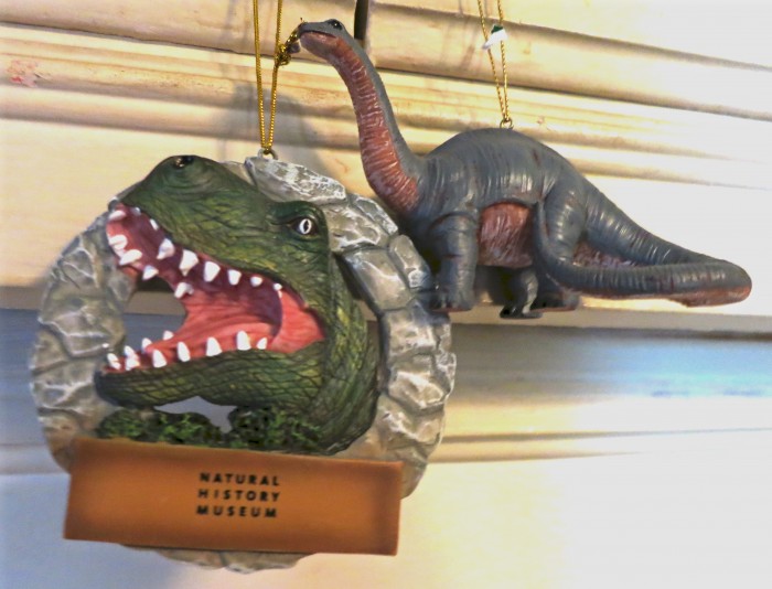Hanging ceramic dinosaur figures (Christmas tree ornaments?).