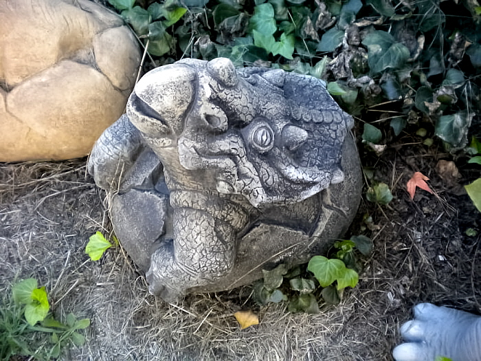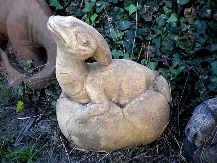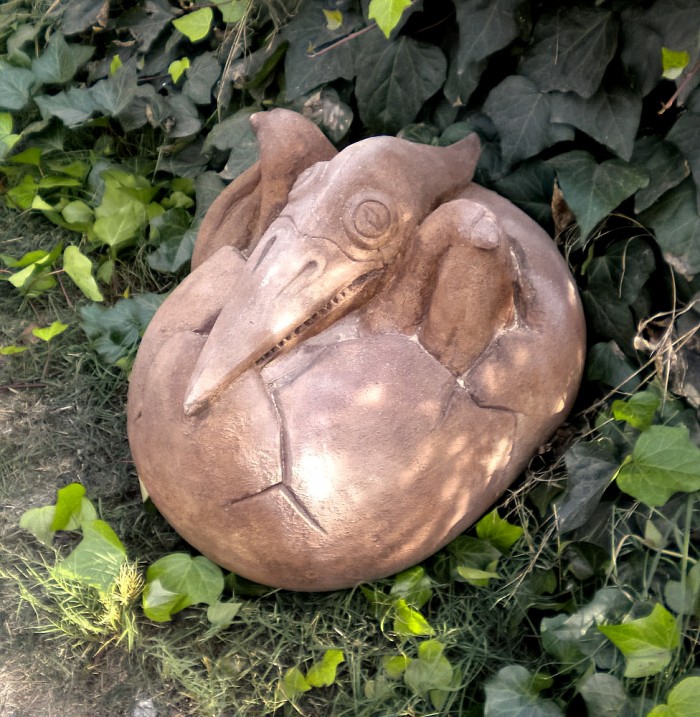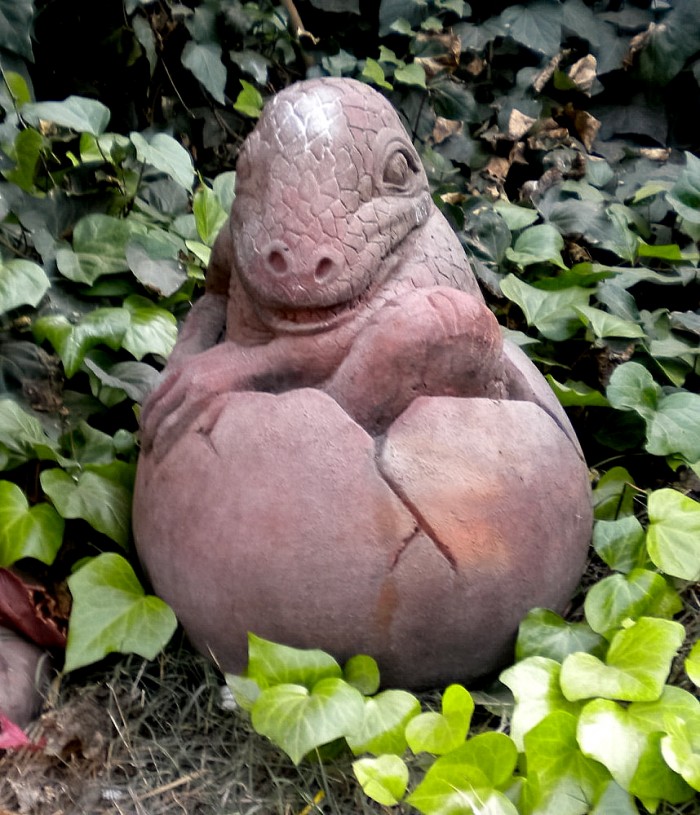 Cement baby prehistoric animals hatching from cement eggs.