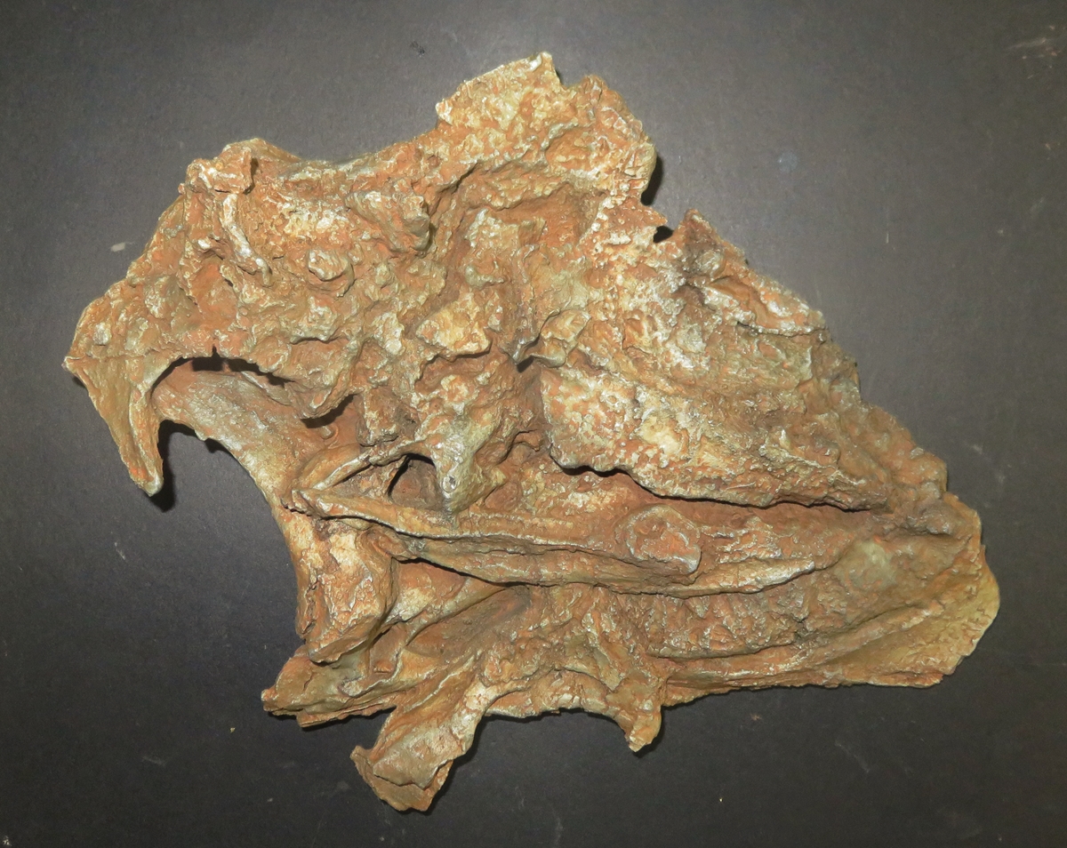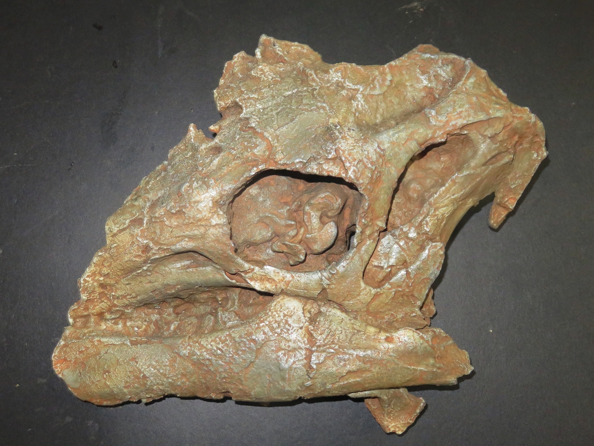 Non-restored incomplete skull (cast) of the relatively small North American (Utah), early Cretaceous iguanodontian ornithopod dinosaur Hippodraco scutodens from Gaston Design, Fruita, CO , in left lateral and (below) medial views. Though much smaller and more archaic, Hippodraco seems to have superficially resembled the lager, geologically younger and better known European iguanodontian Iguanodon bernissartensis.