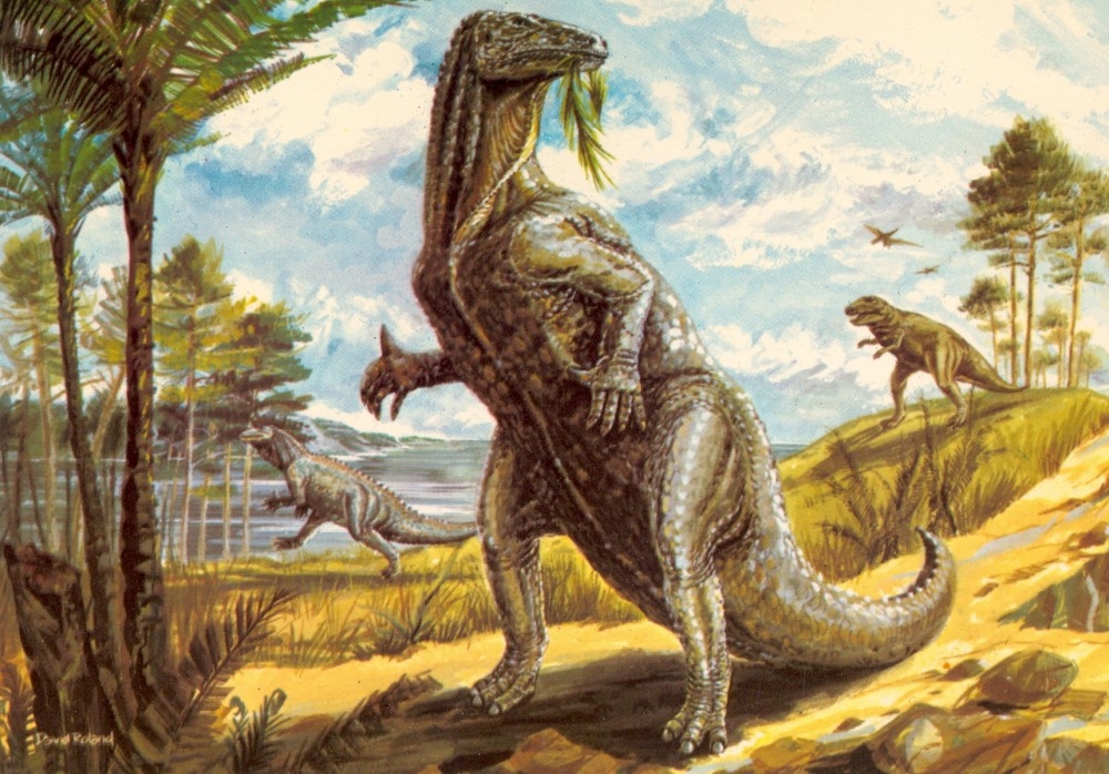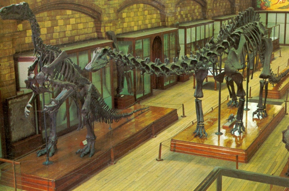 Souvenir postcard (left) from the former British Museum (Natural History) showing an outdated skeletal mount (left) of the more “advanced” European iguanodontian Iguanodon bernissartensis next to a cast skeleton of the giant sauropod Diplodocus carnegii; below that, one of a series of postcards produced in Liason with city of Birmingham Museums and Art Gallery, England, depicting Iguanodon about to be confronted by the theropod dinosaur Megalosaurus bucklandii.