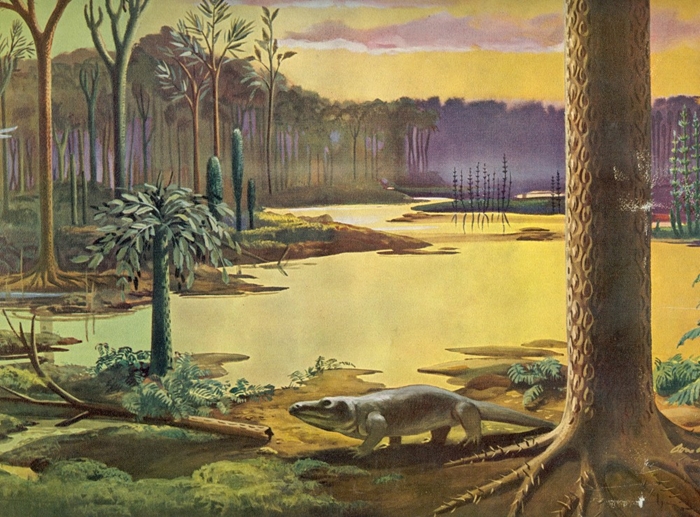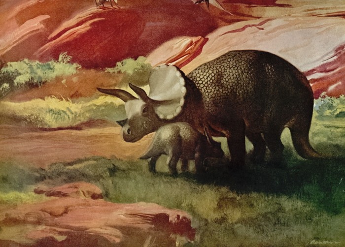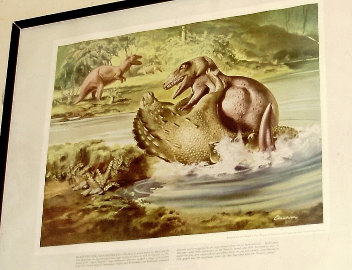 This is one of a set of pictures depicting various prehistoric ages, given away as promotional items in 1948-9 by the Hughes Tool Company. I have others in the set (see below), but they’re not on display.
