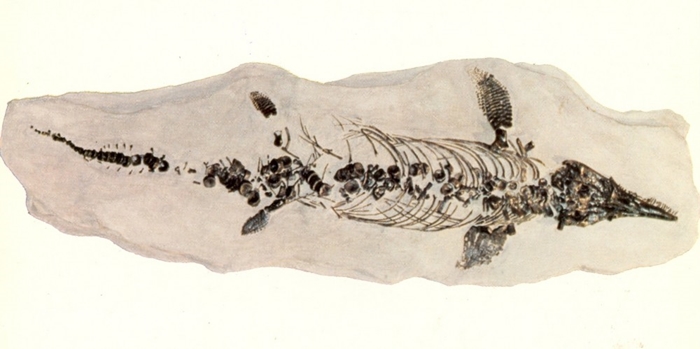 Postcard (below) from the Lyme Regis Fossil Shop Museum, Lyme Regis, Dorset, England, of the skeleton of an icthyosaur from that area.