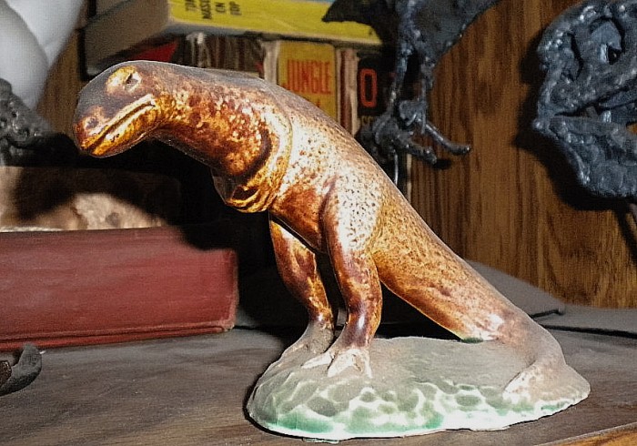Ceramic Allosaurus (one of a set) made by paleontologist James A. (“Dinosaur Jim”) Jensen (1960s?). When I visited the Field House museum in Vernal, Utah, during the mid-1980s, the molds for all of the figures were carefully maintained in the collectiions. Maybe someday someone will get those molds out of storage and reissue these figures. One can hope, anyway.