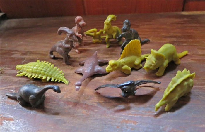 Packages and containers filled with lots of tiny plastic prehistoric animals … including “Itsy Bitsy Dinosaurs” and “Dinosaurs,:” both from Wild Republic (2009).