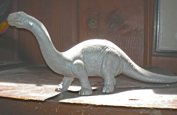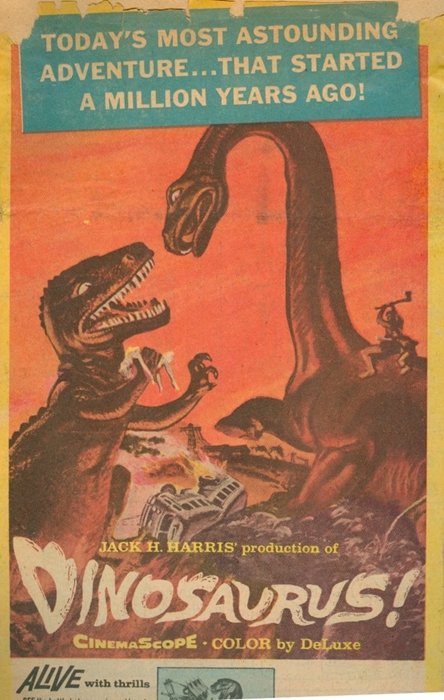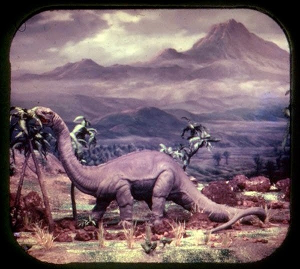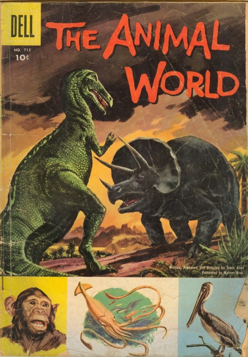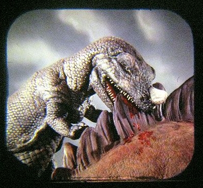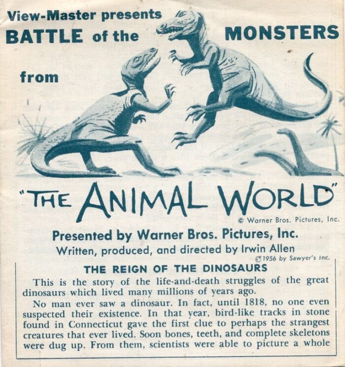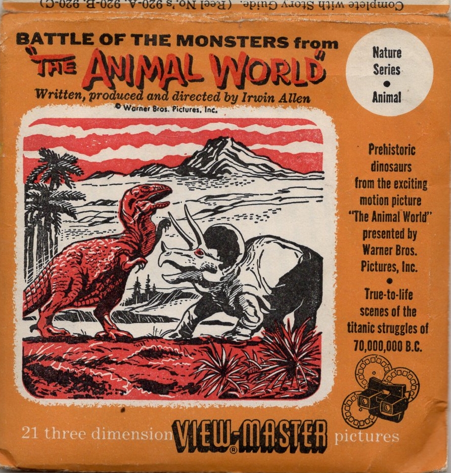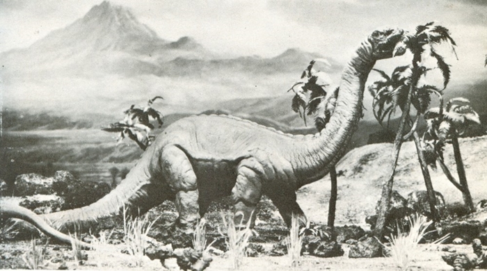 Although this plastic toy Apatosaurus (the Brontosaurus from Marx’s “Prehistoric Times” playset) was not an officially merchandised item, the figure, I believe, was patterned after the stop-motion model animated by Ray Harryhausen and Willis O’Brien in The Animal World.