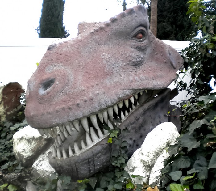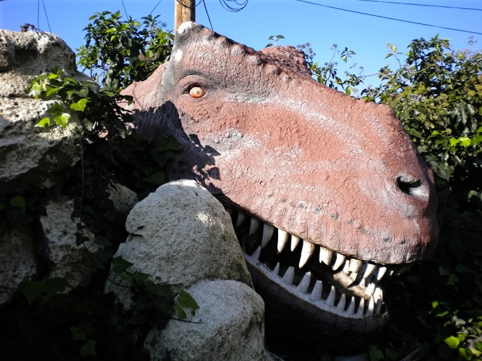 Tyrannosaurus head made by the Jonas Studios in Churchtown, NY. The statue was once equipped with a mechanically moving lower jaw. The original statue was made for Sinclair’s “Dinoland” exhibit at the 1964 New York World’s Fair. This is a copy, made from the same mold, which once stood in a park in St. Louis, Missouri. To see the head enroute to my home, CLICK HERE.