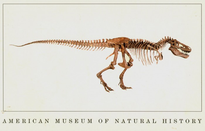 American Museum of Natural History souvenir postcard showing the museum’s remounted T. rex skeleton.