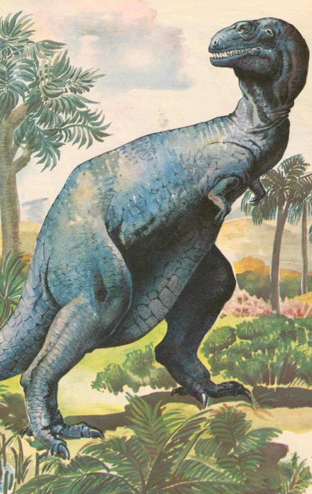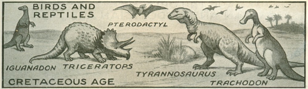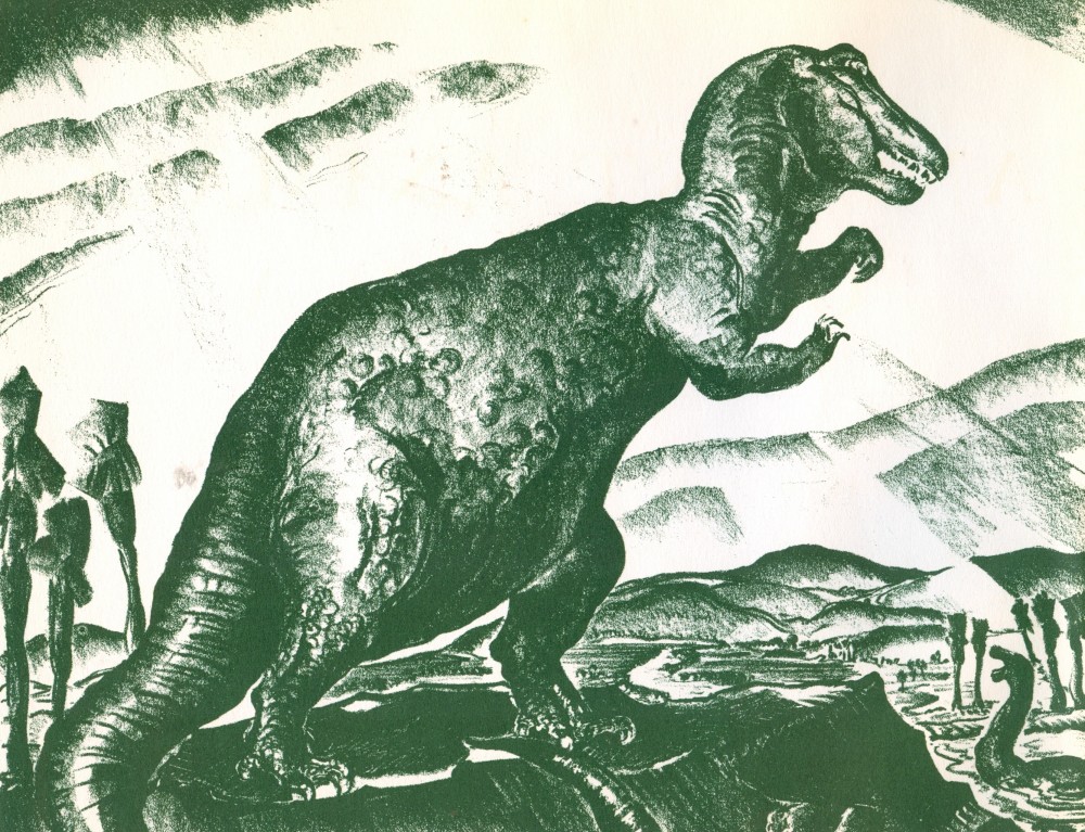 Artwork by Irene Robinson, who transplanted the head (“flopped”) from Knight’s Field Museum mural for this book published in 1934. (Well, at least she used a Knight Tyrannosaurus head.)