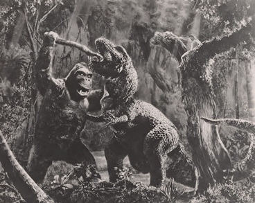 Although the result (lower left) may not be too recognizable, this Tyrannosaurus costume (worn by stuntman Paul Stader), made by special-effects man Fred Knoth (left) for the 1940 movie One Million B.C., was based directly on a black and white photo of Knight’s painting.