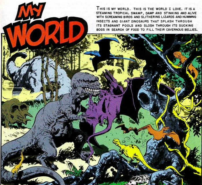 Panels drawn by Joe Kubert in the comic book One Million Years Ago no. 1 (1953) and by Wally Wood in Weird Science number 22 (1953).