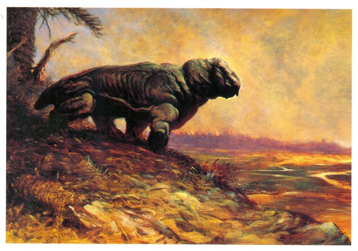 Postcard reproducing a painting by William Stout of Lystrosaurus in ancient Antarctica.