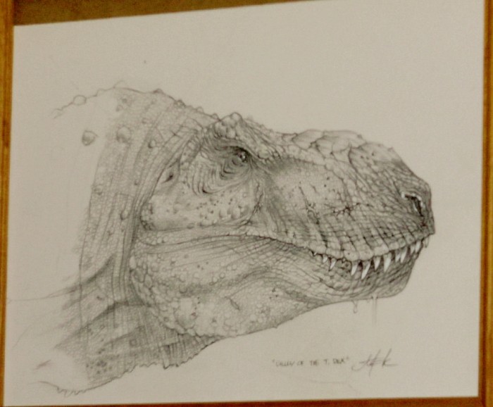 Original drawing of Tyrannosaurus by Mark Dubeau, one of the CGI animators for the Discovery Channel TV mini-series When Dinosaurs Roamed America. This drawing was one of the preliminary pieces of art done for that show that had to be okayed by paleontologist John R. (Jack) Horner.