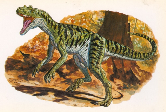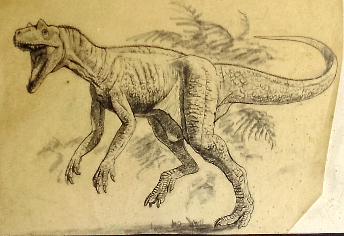 Drawing by Mark Hallett of the early (Late Triassic) carnivorous dinosaur Herrerasaurus, done for my book The New Dinosaur Dictionary (1982). This was actually the preliminary pencil sketch Mark did prior to his doing the color painting reproduced in this collectors postcard.