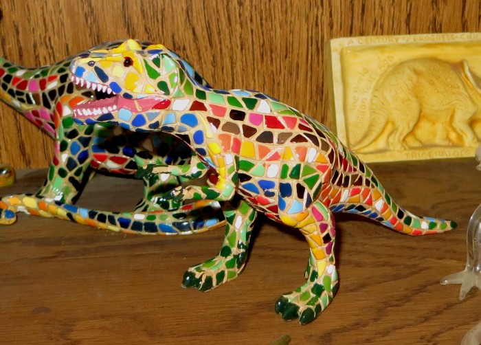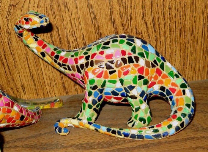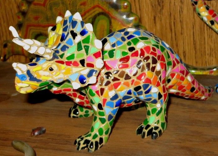 From Barcino of Barcelona, Spain (but made in China), dinosaur figures “of an innovative design inspired by the mosaic technique Trencadis. Hand painted with more than 10 colours.”