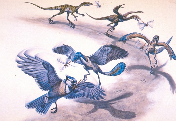 “Dinosaur into Bird” artwork by paleoartist Mark Hallett, part of “The Dinosaur Postcard Book” (1987) from Running Press. The penultimate animal depicted is Archaeopteryx.