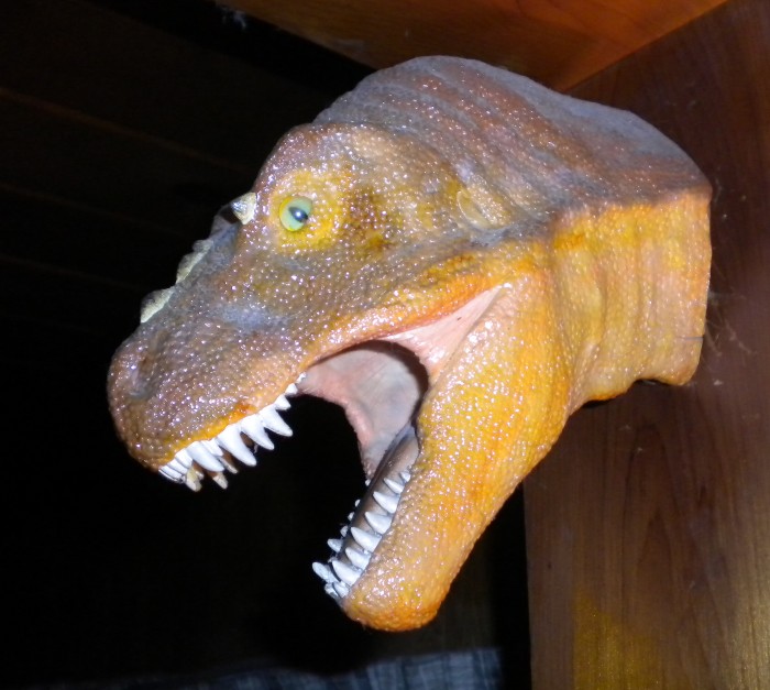 One-of-a-kind resin Tyrannosaurus and Carnotaurus heads sculpted by Mike Jones.