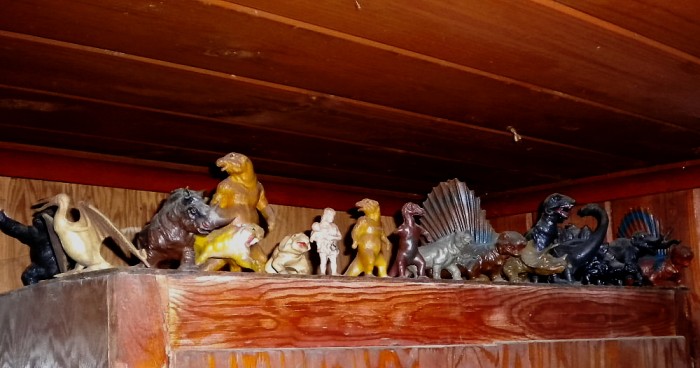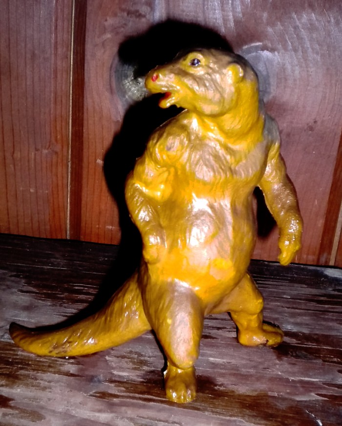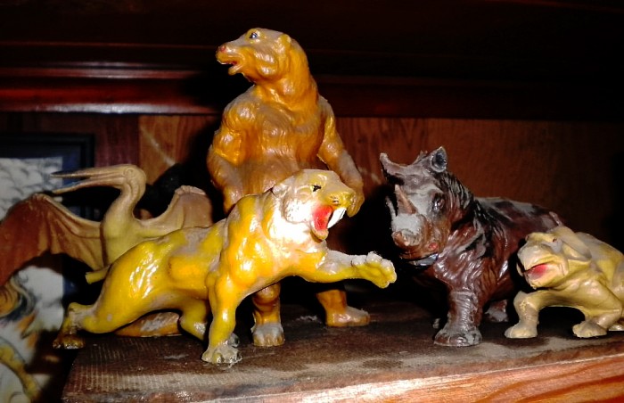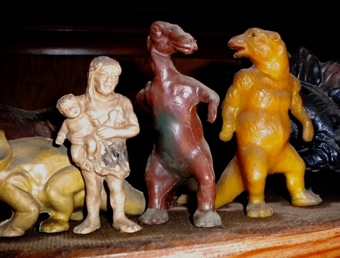 “Waxy” plastic prehistoric animals and cavemen toys made by Miller in 1956. The animals came in both large and small sizes. Kresges dime stores originally sold the large toys for 39 cents apiece. Today, when they can be found in good condition, their going price is considerably higher.
