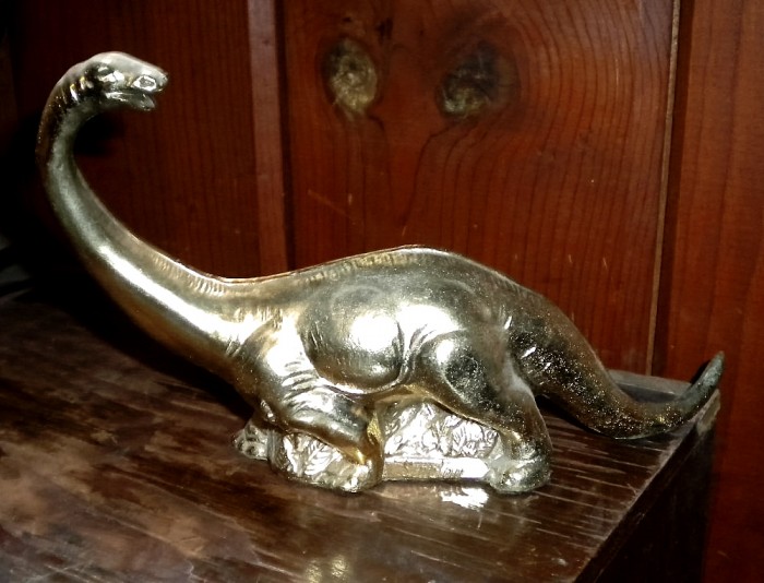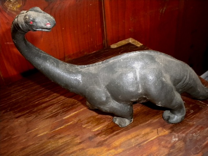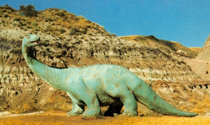 The Miller “Brontosaurus” (correctly Apatosaurus) was the basis for a Sinclair metal collectibible of the 1960s, a large statue (as shown in a postcard) at Drumheller, Alberta, Canada’s “Prehistoric Parks,” and also a ceramic figure by Elizabeth Simpson, also from Drumheller.