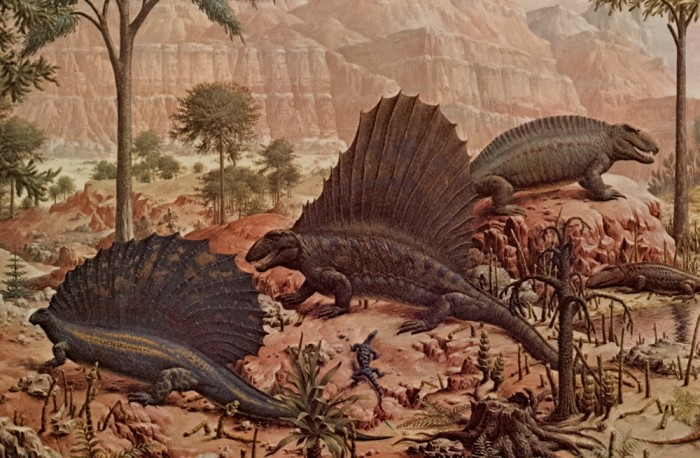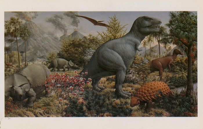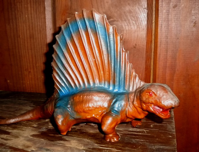 This Miller Dimetrodon figure was based on Zallinger’s depiction of the sail-backed pelycosaur in his “Age of Reptiles” painting, reproduced in the souvenir postcard from Yale University’s Peabody Museum of Natural History shown below.