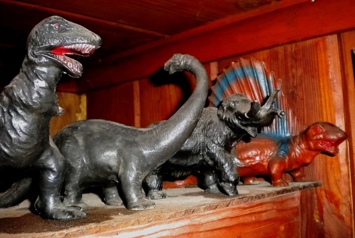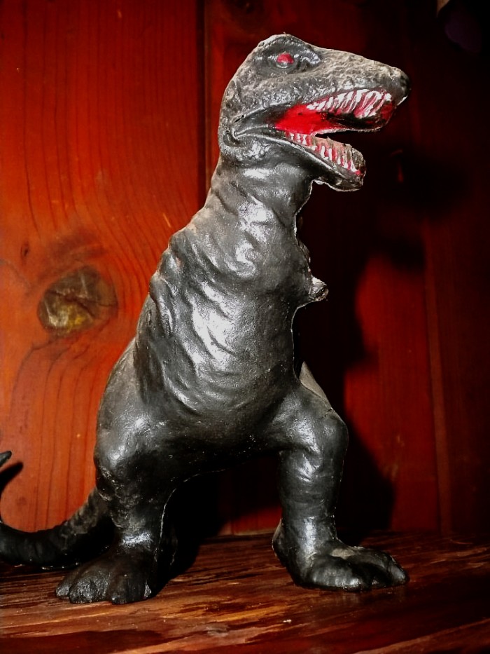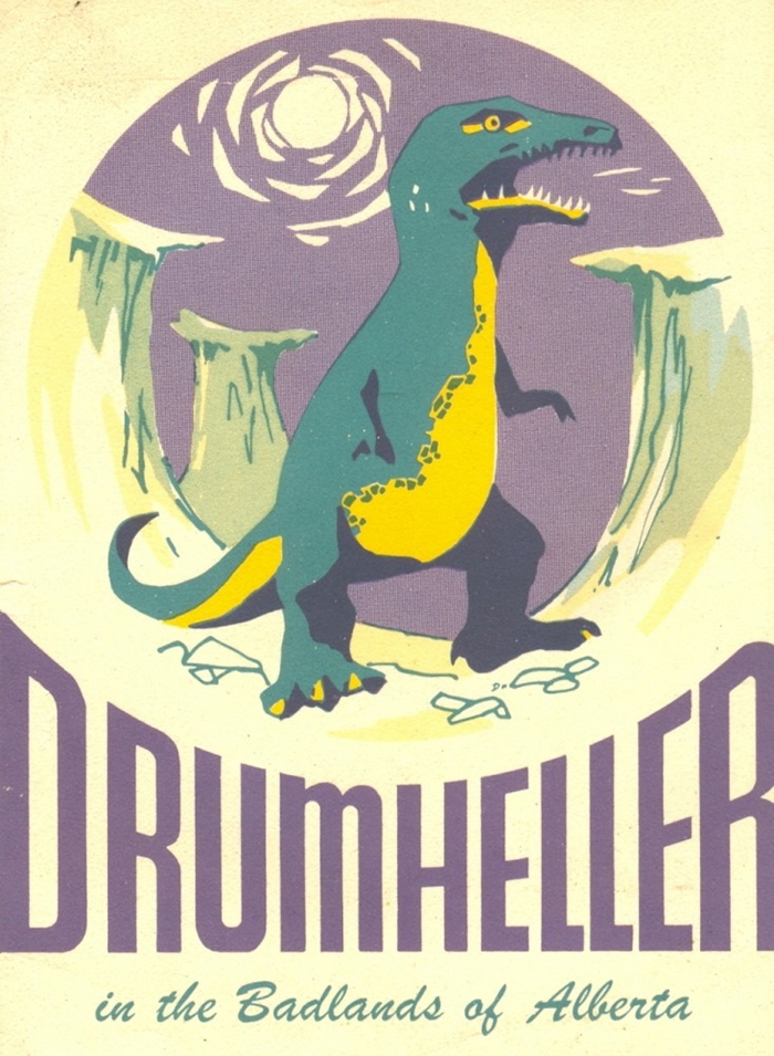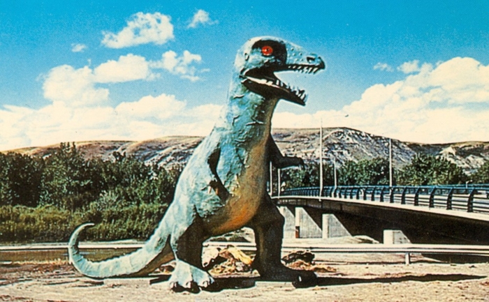 While Miller’s Tyrannosaurus (below) was based on the one depicted by artist Rudolph Zallinger in his “Age of Reptiles” mural for Yale University’s Peabody Museum of Natural History (some of the other Miller figures were also based on Zallinger’s work), the toy seems to have been the inspiration for this statue on display at Dinosaur Valley Bridge in downtown Drumheller, Alberta, Canada (both painting and statue seen in these souvenir postcards).