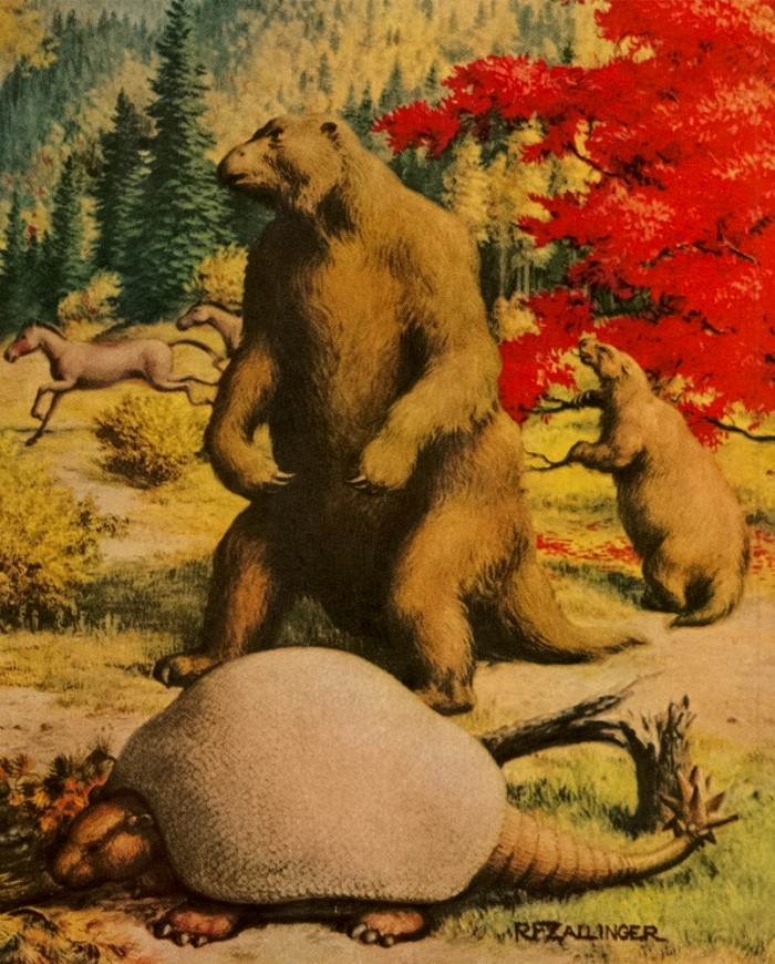 Miller’s figure of Megatherium, a giant ground sloth, was based on the animal as featured in Zallinger’s “Age of Mammals” mural., also done for the Yale museum.