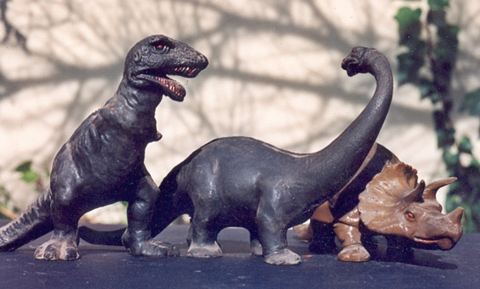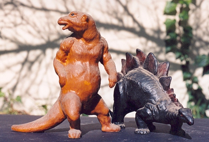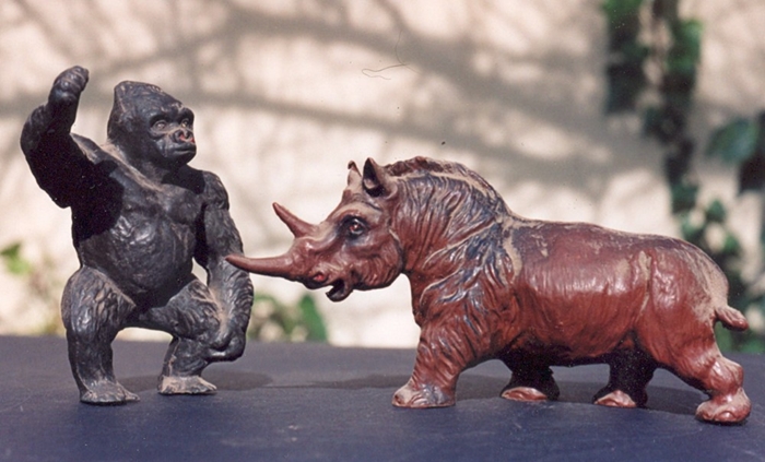 These Miller waxy plastic prehistoric creatures were the stars of my second amateur 16mm movie, The Earth Befpre Man, another dinosaur film, made in 1956. I knew nothing about special effects in those days, so I made the animals move by pulling them along on “invisible” threads. At the time, and to my child’s eyes, the result seemed quite spectacular. The ape, by the way, was not part of the Miller set. But I’d just seen the movie King Kong for the first time, and…