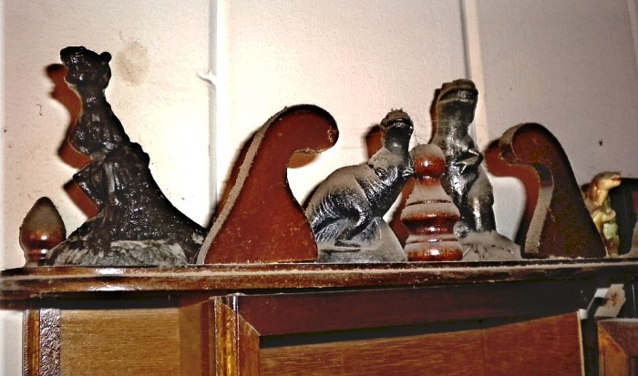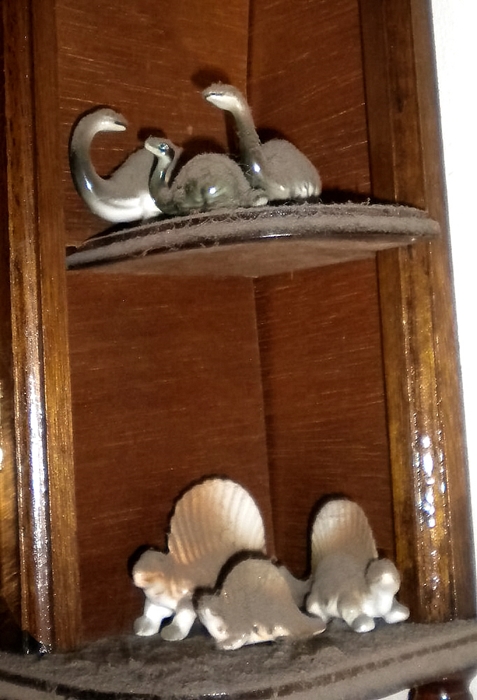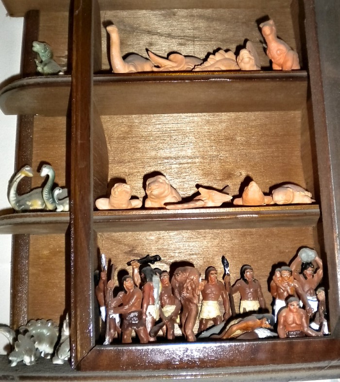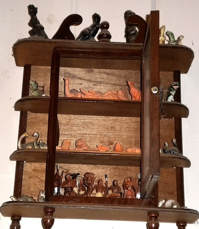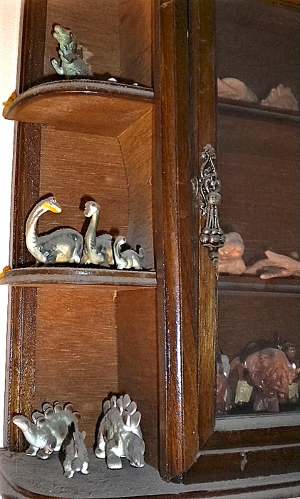 Small cabinet conatining numerous and various tiny prehistoric creatures, including some ceramic dinosaur “families.”