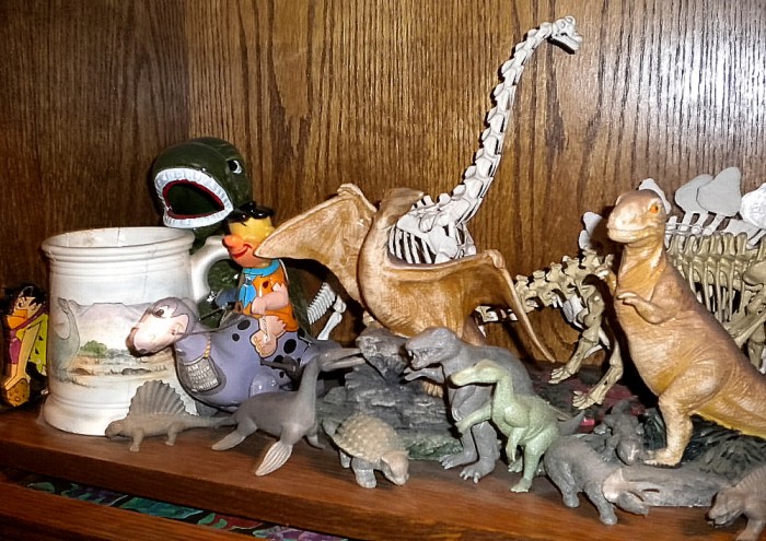 Fourth shelf, loaded with collectibles, including original-series Marx “Prehistoric Times” playset toys (ca. 1955), Marx wind-up Fred Flintsone riding on “Dino,” and Battat model kits of Brachiosaurus and Stegosaurus and ITC (Ideal Toy Company) Apatosaurus (referred to as Brontosaurus) skeletons, and other items.