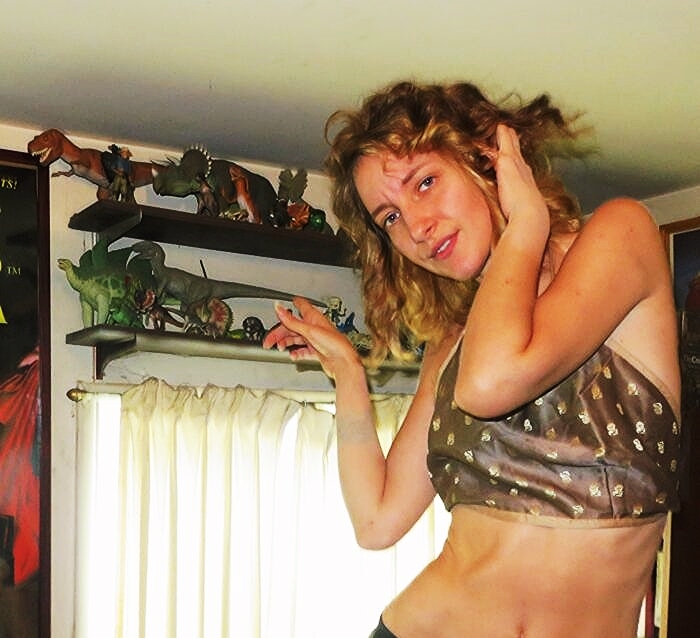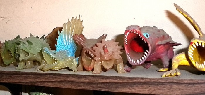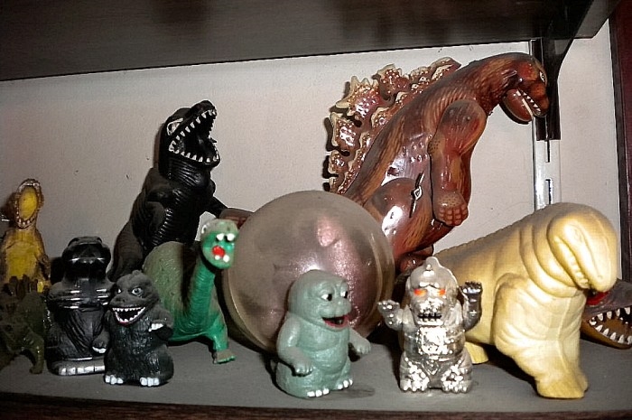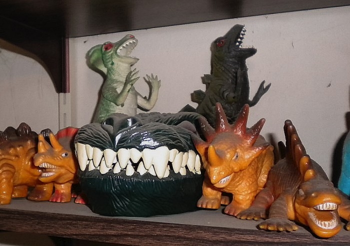 Just some of the many (space-conserving) shelves displaying miscellaneous dinosaur toys (including some Godzillas) — way too many and too hight up for dusting.