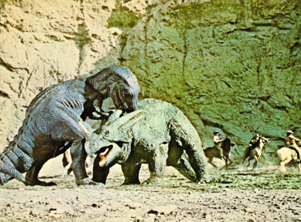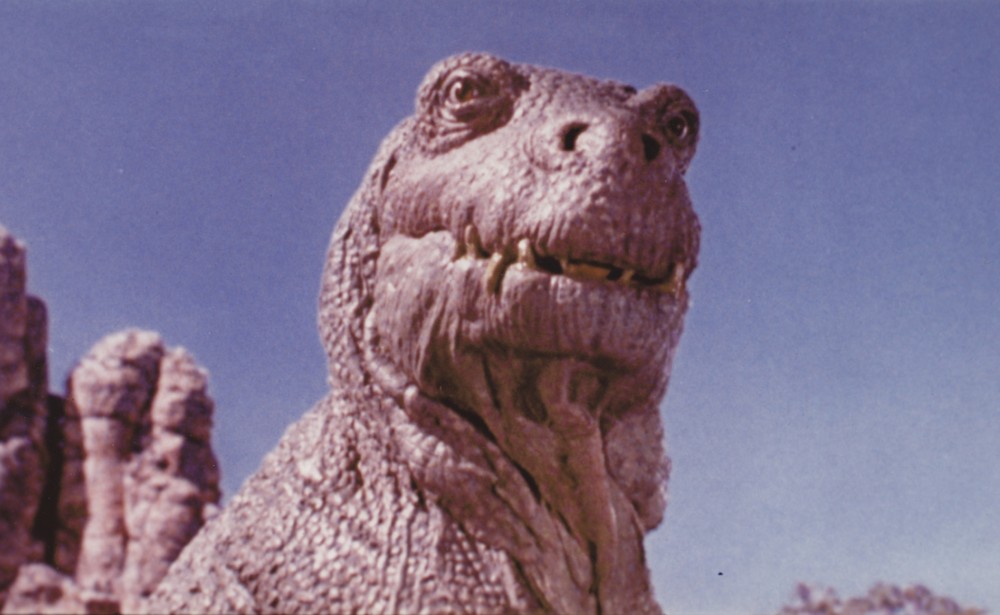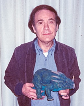 Left, resin copies (models made to last) of two more stop-motion/animation models from dinosaur movies, these in a friend’s collection. The Styracosaurus (above), sculpted by Arthur Hayward and animated by Ray Harryhausen, appeared in Valley of Gwangi (1969); and below, the fat Tyrannosaurus. sculpted and animated by David Allen, is from the Ringo Starr comedy Caveman (1981).