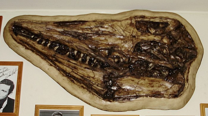 Skull (cast) of a mosasaur, a Mesozoic marine reptile related to today’s monitor lizards.