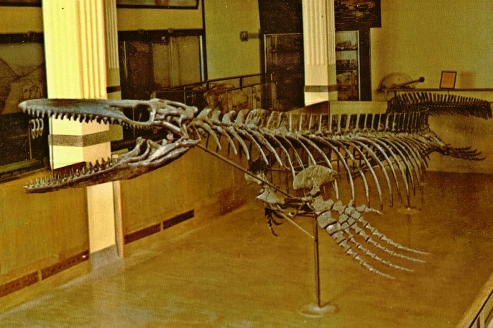 Souvenir postcard from the Museum of Geology, South Dakota School of Mines and Technology, Rapid City, showing the museum’s mounted skeleton of the mosasaur Mosasaurus conodon.