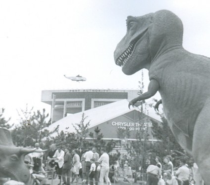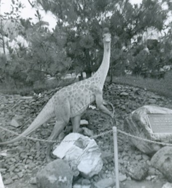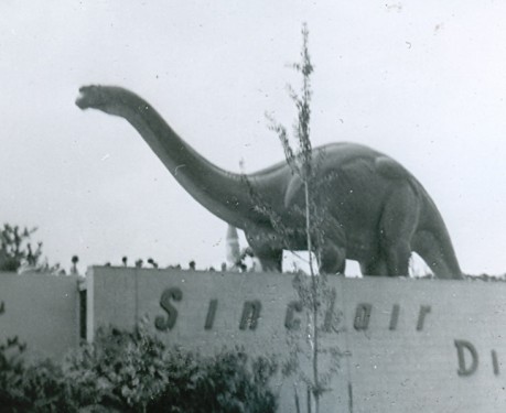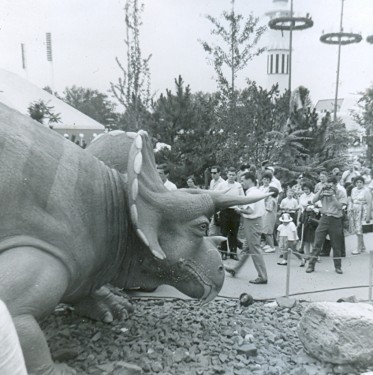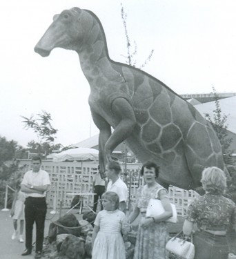 Snapshots from my visit to the World’s Fair in August, 1964. I’m in the last one, standing with arms folded in front of the duckbilled dinosaur Edmontosaurus (then called “Trachodon“). To see some pre-Fair publicity photographs of these dinosaurs CLICK HERE…and some memorabilia from Sinclair’s “Dinoland” exhibit, CLICK HERE.