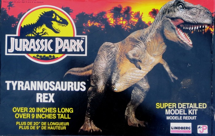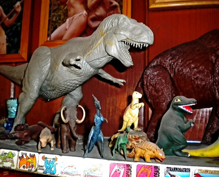 Shelves with more dinosaur and other prehistoric figures, like this Jurassic Park unpainted plastic assembly kit of Tyrannosaurus rex.