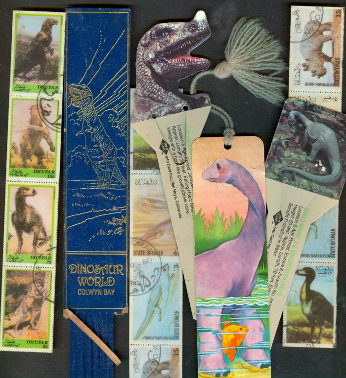 I have many, many books about dinosaurs and and other subjects of prehistory, including technical, popular and juvenile books. My paleo-library also has a good number of children’s  books, numerous technical journals — and also popular paleo-related publications like Prehistoric Times.  And, of course, there are also dinosaur bookmarks…