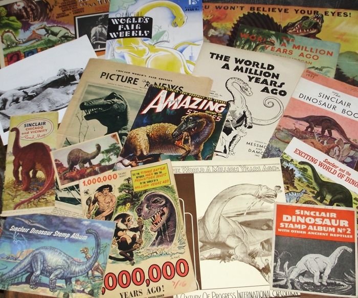 If you can write or draw on it, it’s probably at one time or another featured a dinosaur. Most prehistoria collections have their share of paper items featuring dinosaurs and other things prehistoric. These are very few of my 100s of paper items including postcards, comic books and strips, pulp magazines, fiction and nonfiction books, Big Little Books, pamphlets, guide books, movie posters, lobby cards, still photographs and pressbooks, sheet music, maps, magazines. articles, newspaper clippings, etc. that I have throughout the house.