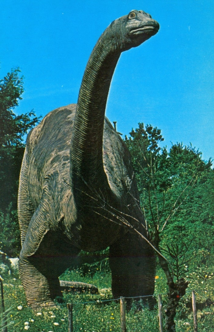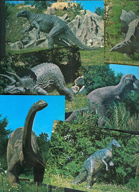 Montage of souvenir postcards from Parco Zoo del Garda-Parco del Dinosauri, a park in Bussolengo-Pastrengo, Italy, featuring life-sized statues of prehistoric animals.