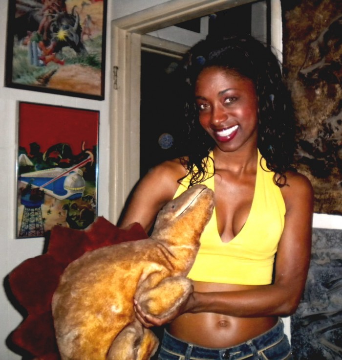 Atop the curio cabinet, a variety of prehistoric-animal plush toys.